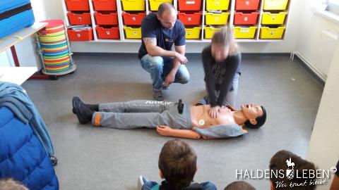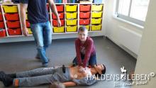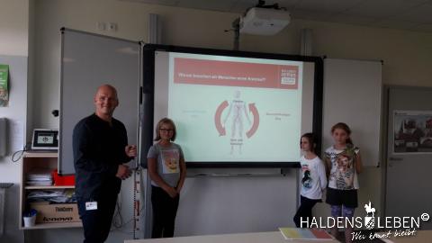 Am 20. September 2017 beschäftigten sich unsere Viertklässler in einem Unterrichtsblock mit dem Thema Erste Hilfe und Wiederbelebung beim Menschen. Angeleitet wurden sie dabei fachmännisch von den beiden Rettungssanitätern Jens und Alexander vom Landkreis Börde. An einer Übungspuppe durften die Kinder die Herzdruckmassage ausprobieren und erfuhren viele zusätzliche Informationen bezüglich Wiederbelebungsmaßnahmen.