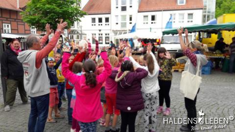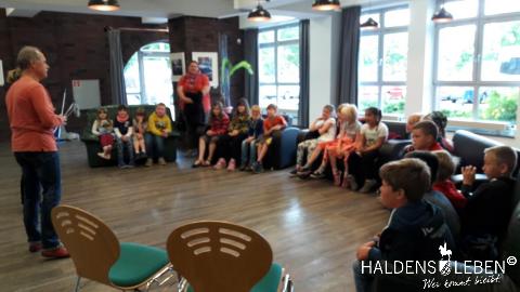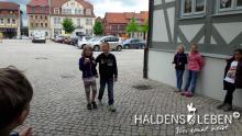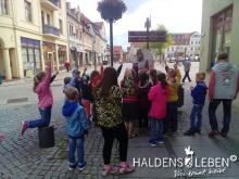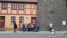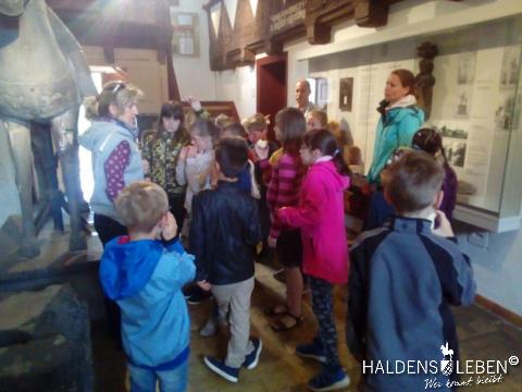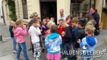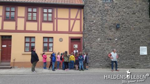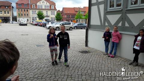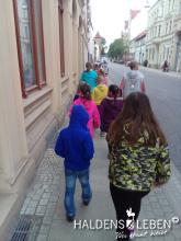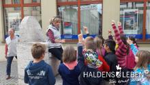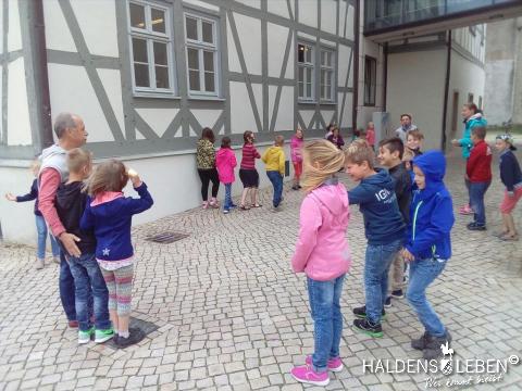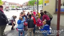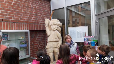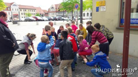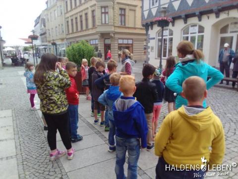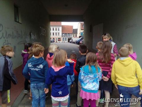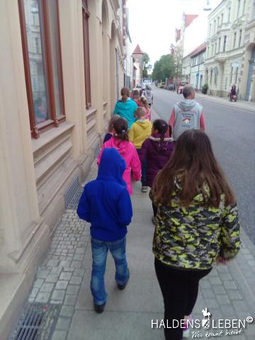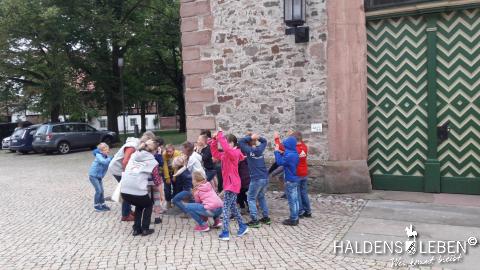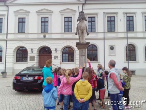 In der vorletzten Schulwoche beschäftigten sich alle Lerngruppen der SEP im Sachunterricht mit dem Thema "Haldensleben". Höhepunkt für alle Zweitis ist dabei unsere alljährlich stattfindende Rolli-Runde, bei der unter Anleitung von Frau Lutz und Herrn Schreiber viele Sehenswürdigkeiten unserer Stadt erkundet und besichtigt werden. Rolli, der kleine Bruder vom Reitenden Roland, zeigt uns dabei stets den Weg. Also hieß es "Augen offen halten!" und Ausschau halten nach möglichst vielen der insgesamt 22 vorhanden, im Fußboden eingearbeiteten Bronzeplaketten. Höhepunkt des Rundgangs war am Ende im Bülstringer Torturm die Legende von Kasimir und Felicitas, die uns alle noch einmal etwas gruseln ließ... :-)